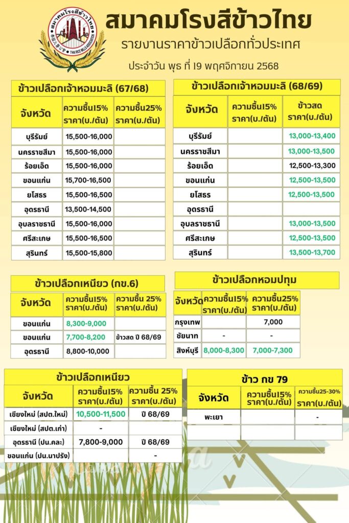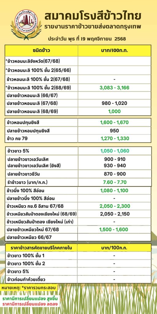ราคาข้าวประจำวัน พุธ ที่ 19 พฤศจิกายน 2568