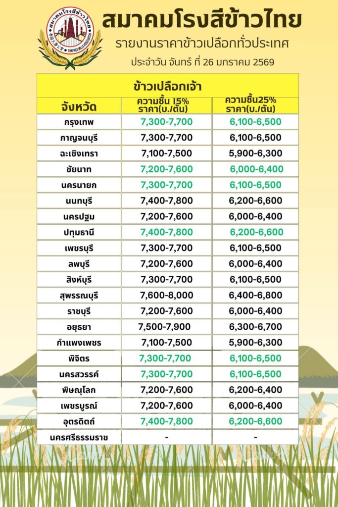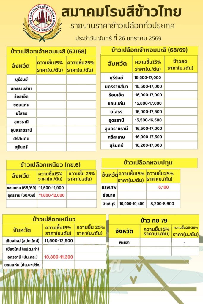 ราคาข้าวประจำวัน จันทร์ ที่ 26 มกราคม 2569