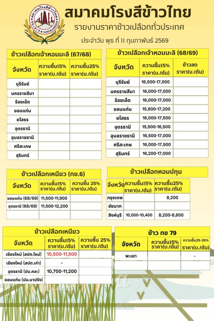 ราคาข้าวประจำวัน พุธ ที่ 11 กุมภาพันธ์ 2569 11 กุมภาพันธ์ 202611 กุมภาพันธ์ 2026 webmaster ราคาข้าว webmaster