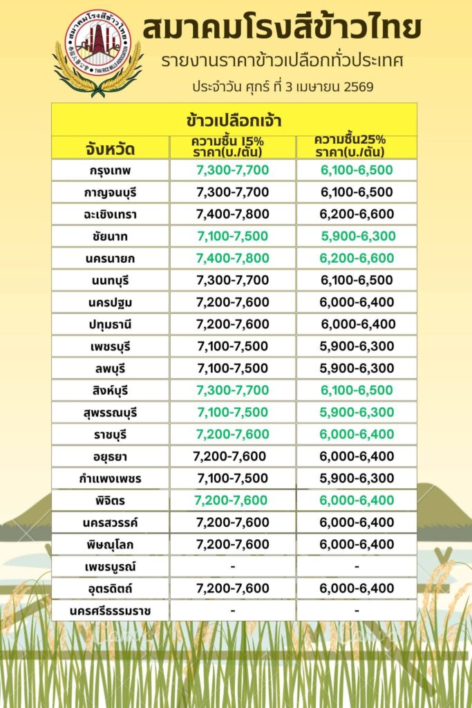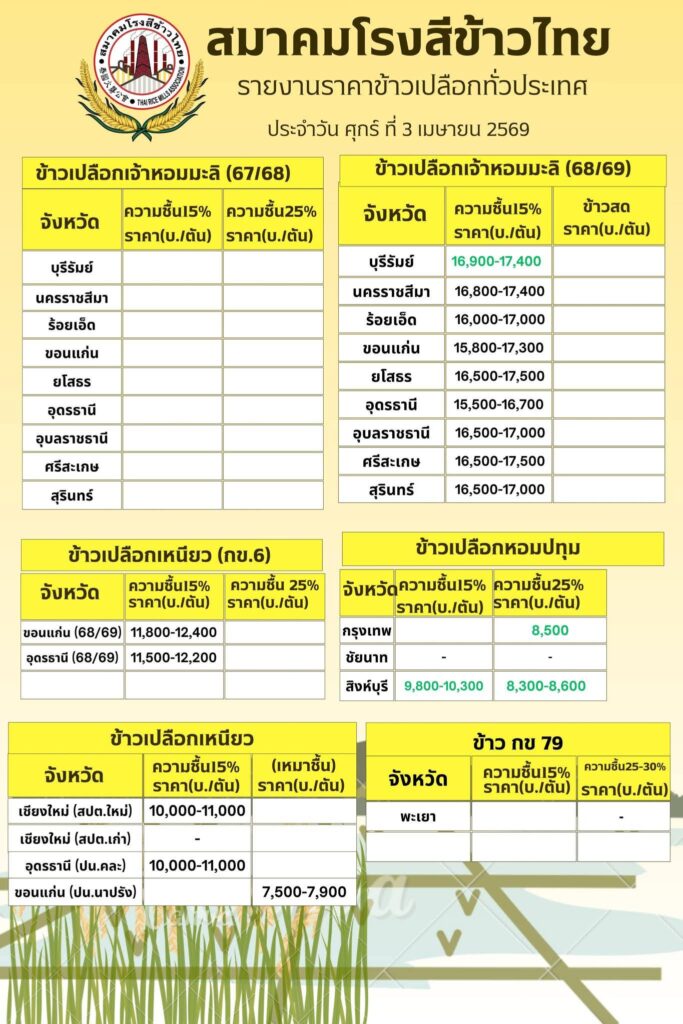 ราคาข้าวประจำวัน ศุกร์ ที่ 3 เมษายน 2569