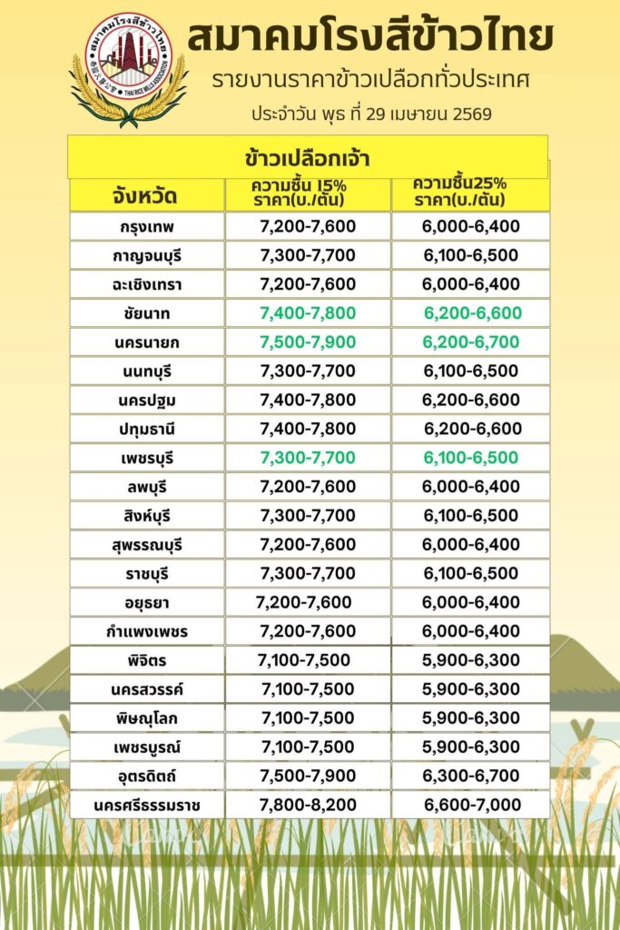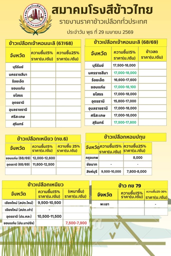 ราคาข้าวประจำวัน พุธ ที่ 29 เมษายน 2569